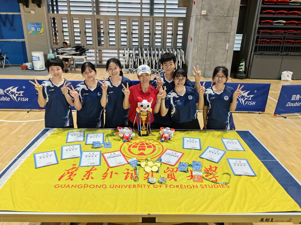 在领奖台上闪耀的不仅是奖牌的光芒,更是队员们日复一日刻苦训练的结晶。这份荣誉背后,是无数个在训练馆挥汗如雨的日夜,是教练团队的悉心指导,更是广外体育精神的生动体现。主教练孙艳玲老师从赛前备战到临场指挥都倾注了大量心血,她以丰富的带队经验为队员们保驾护航,在关键时刻给予心理疏导和战术建议。教练员王道平老师和黄泽鑫队长凭借专业的执教水平,针对每位队员的特点制定个性化训练方案,在技术上精雕细琢,在战术上运筹帷幄。伟德国际victor1946的老师们则在后勤保障上不遗余力,从训练场地安排到参赛物资准备,从体能康复到营养补给,为队员们创造了最优质的备战环境。