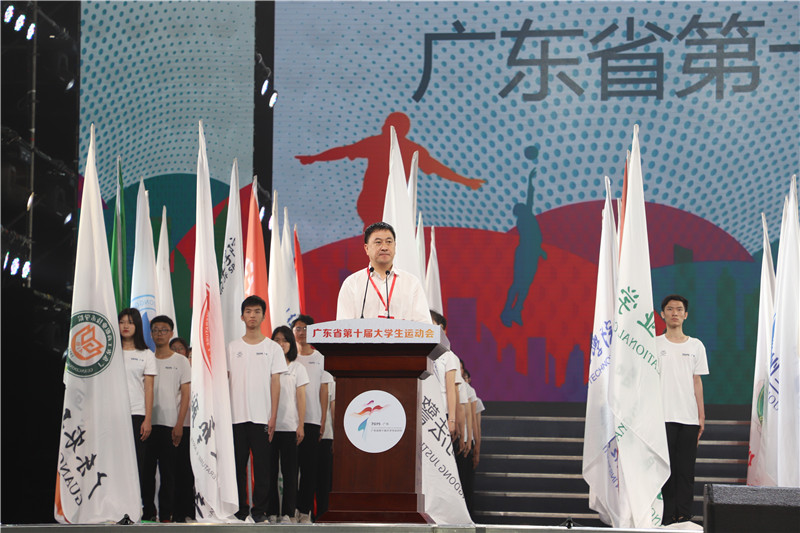 广东省第十届大学生运动会组委会主任,省委教育工委书记,省教育厅党组书记、厅长景李虎致开幕辞。他表示,本次大运会认真贯彻习近平总书记在全国教育大会上强调的树立“健康第一”的教育理念,是对我省高校体育工作的一次综合性检验。“迸发激情,追逐梦想是青年的本色!”他呼吁各位大学生积极投身于运动中去,并希望各代表队把本次大运会作为重要的展示平台,充分展示高校体育的改革成果。