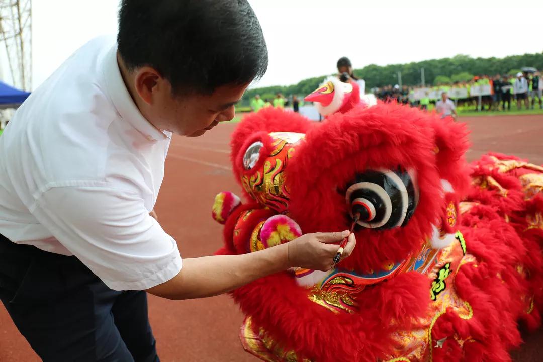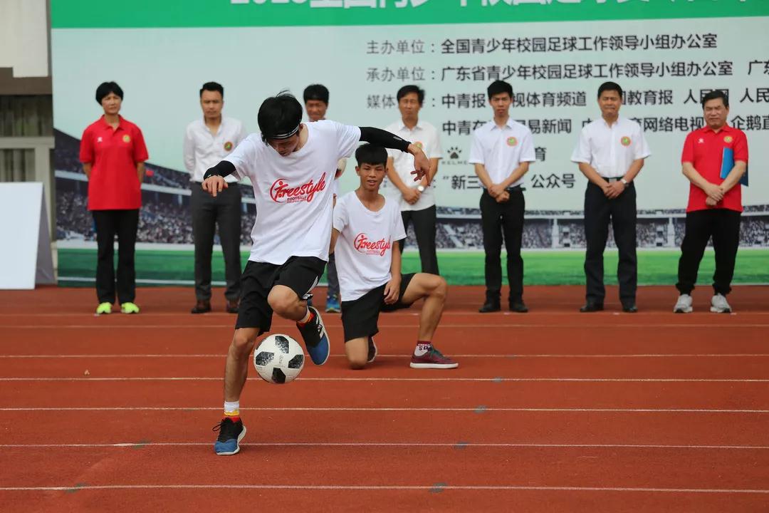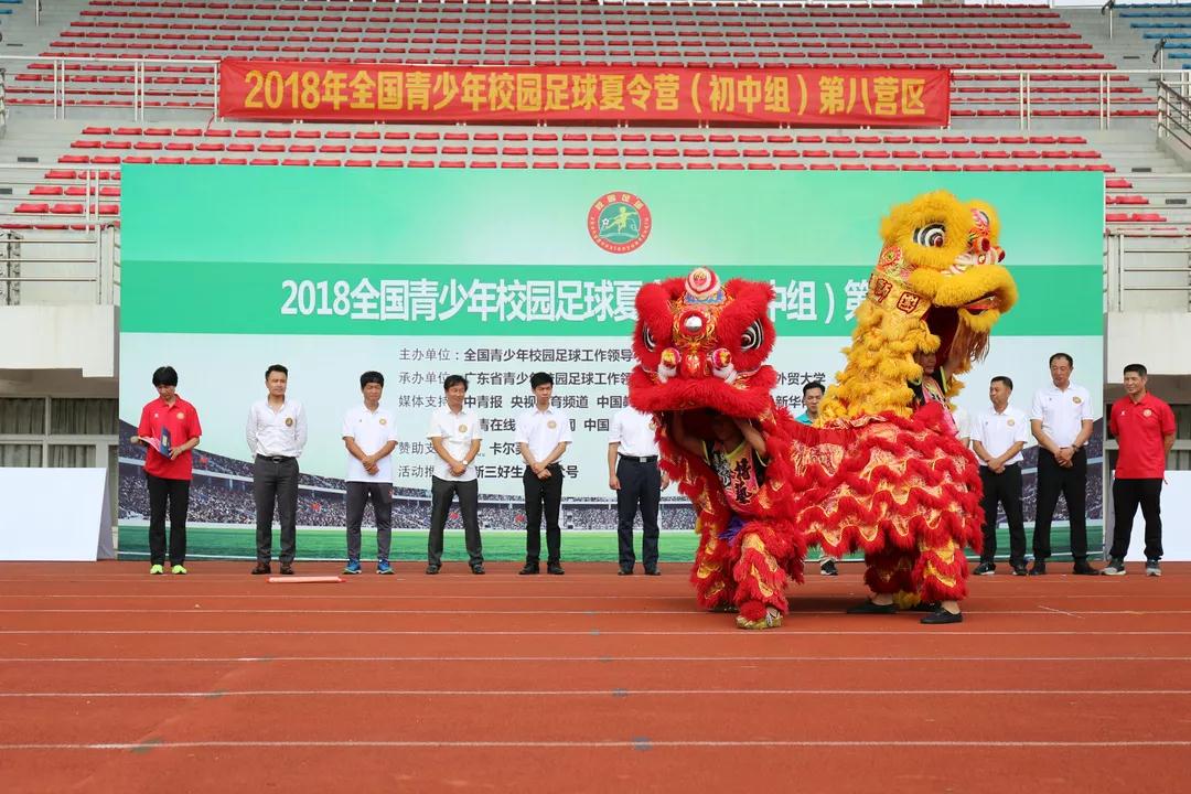 广东省教育厅副巡视员邱克楠宣布2018年全国青少年校园足球夏令营(初中组)第八营区开营。在运动员和裁判员宣誓之后是精彩的花式足球表演和舞狮表演。