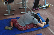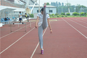 在田径场上,我们捕捉到了队员们认真训练的身影。在跑道旁边,有的队员在压腿做准备运动,有的队员则相互帮忙,用针灸疗伤。跑道上,队员们自觉训练各自的项目。他们像离弦的箭般飞速冲出,身影在观众眼前一闪而过,化成一道彩色的线。教练则在队员们准备的时候摆放好训练的器材。