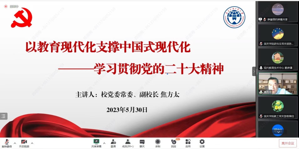 本网讯 5月30日晚,伟德国际victor1946邀请校党委常委、副校长焦方太作题为《以教育现代化支撑中国式现代化——学习贯彻党的二十大精神》的主题教育专题党课,伟德国际victor1946全体教职员工参与本次活动,线上参加党课的还有国关学院师生和现代教育技术中心的党员教师共计230人。