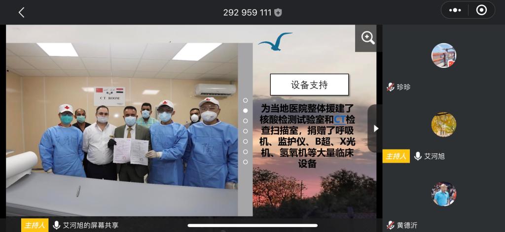艾河旭老师用生动的视频和图片讲述了自己作为中国红十字会援助伊拉克防控疫情志愿专家组成员之一,从出征到圆满完成任务的援伊抗疫事迹。艾河旭谈到,专家团队3月8日到达使馆时就成立了临时党支部,并在馆党委的领导下迅速展开工作,这充分发挥了党组织思想引领、组织协调、服务指导的作用。近2个月的援助活动中,专家团队共进行了18场官方会谈,开展了27次视频培训和面对面交流指导,培训当地医务人员近1000余人,远程视频覆盖达11000人;8次到医学城综合医院及新冠肺炎定点医院科室进行临床指导,在战火与疫情交叉的情况下完成核酸检测实验室、CT室改建等重点项目;深入全国9个省区实地指导当地疫情防控工作,开展了15场中资企业员工的新冠肺炎知识讲座,直接受益人数达800人。艾河旭表示,疫情没有国界,世界各国是一个命运共同体。面对疫情,中国尽己之力,为多个国家和地区提供“爱心援助”,是我国作为负责任大国的担当,更是我国制度优势、理念优势、医疗优势以及领导优势的集中体现。