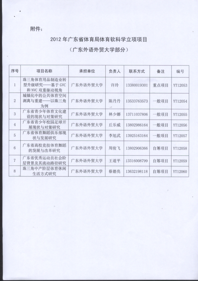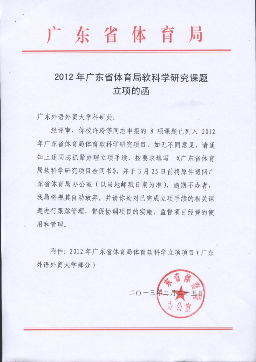 本网讯 伟德国际victor1946在2012年底申报广东省体育局软科学课题共14项,其中有8项获广东省体育局软科学课题立项。