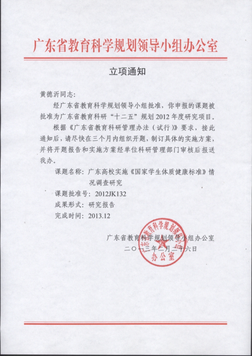 另,黄德沂老师所申报的课题广东高校实施《国家学生体质健康标准》情况调查研究>被批准为广东省教育科研“十二五”规划2012年度研究项目。