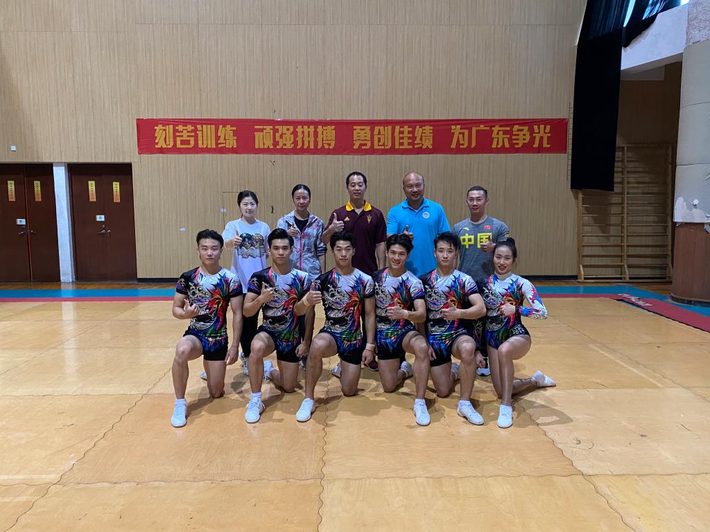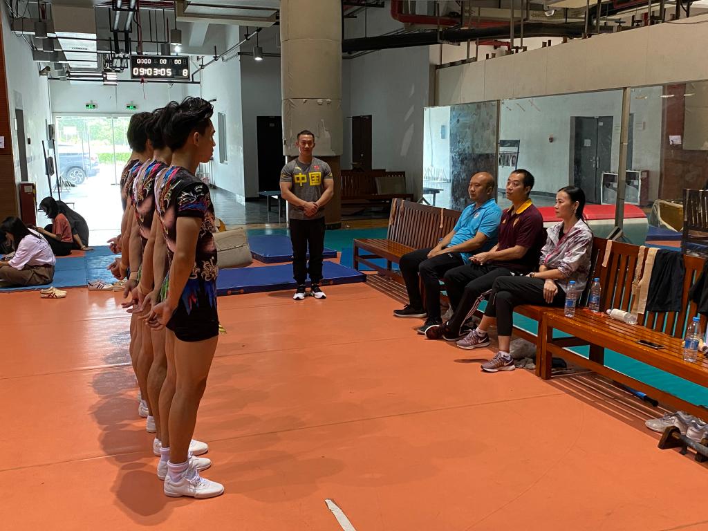 本网讯 10月7日,中华人民共和国第十四届全国学生运动会广东健美操代表队大学组运动员们的赛前第二次测试在体育馆副馆进行。为了检验广东代表队教练和运动员们的训练成果,伟德国际victor1946黄德沂副主任、华南理工大学庄巍教授 、华南理工大学丁文老师在百忙之中莅临伟德国际victor1946,对大学组的运动员们作出动员和指示。
