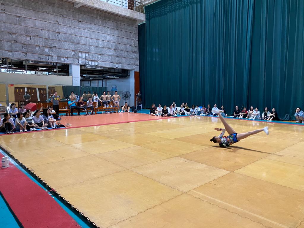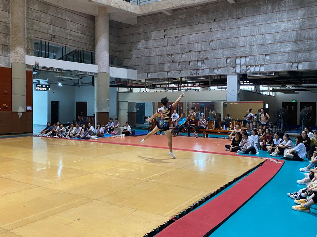 在全国学生运动会健美操大学组主教练黎良发的指导下,运动员们有条不紊的进行了成套前的热身,调动起身体和情绪为测试作好准备。这次测试运动员们的心理素质明显提高,以较为饱满的精神状态作出了成套展示,稳定地发挥出了正常水平。相较于第一次赛前测试,所有项目的成套都有明显的进步,这显然说明教练员和运动员们的努力取得了不错的成效。