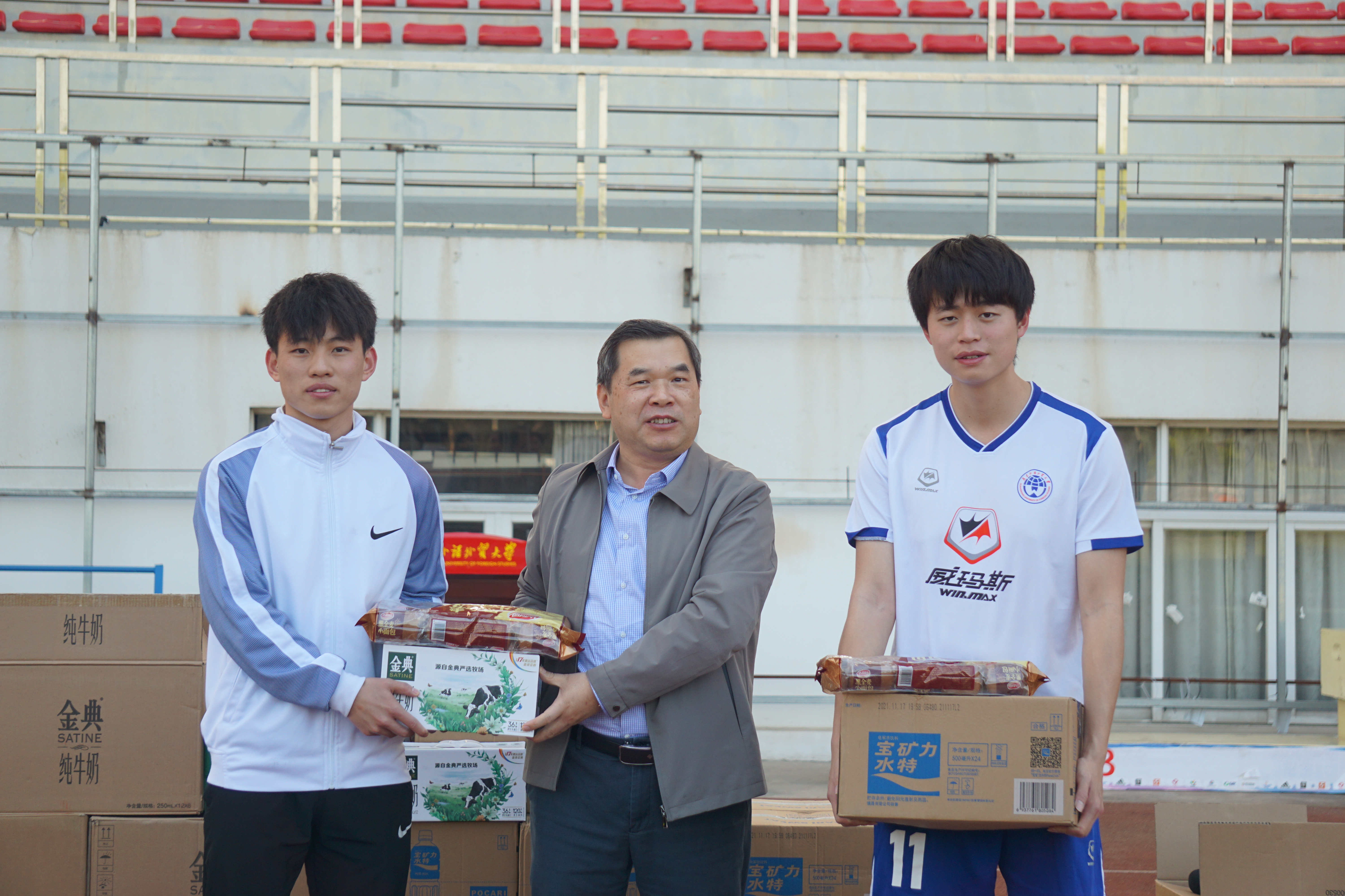 副校长焦方太到达训练场地后与各运动队运动员、教练员亲切交谈,听取教练员的训练工作情况,了解队伍在备战过程中遇到的问题和困难,及时给予协调和解决,并向各运动队送上慰问品。