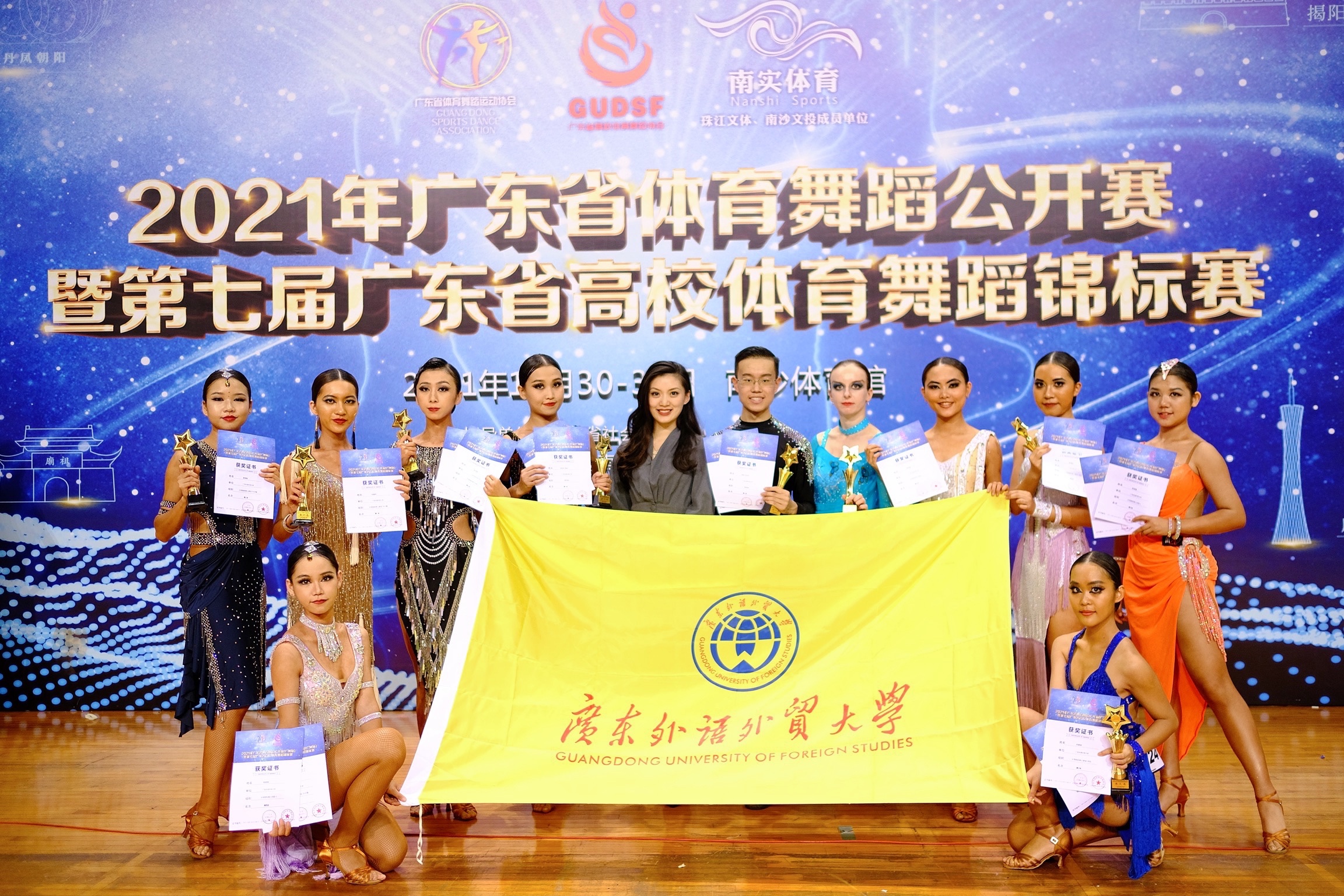 2021年10月30-31日,由广东省体育舞蹈运动协会主办的广东省体育舞蹈公开赛暨第七届广东省高校体育舞蹈锦标赛在广州市南沙区南沙体育馆顺利开赛。本次比赛吸引了全省各高校及各地优秀运动员们的积极参与,广外校体舞队的队员们在领队李旭武主任的带领、教练李林静老师的指导下为校出战。