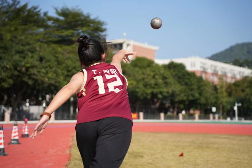 当被问到取得佳绩的“秘诀”时,吴桐斌说道:“我练习三级跳远已经七年了,这个热身姿势能让我更好地调动自己整个身体。”既怀着运动的兴奋与激昂,又不失沉着冷静,吴桐斌轻轻一跃,便引得全场观众欢呼,纷纷举起手机抓拍这一精彩瞬间。长期的市队训练经验助力他在校运会中保持节奏稳定,发挥出超群的实力。“比赛前没有对成绩做出预想,只想着要跳好一点,不辜负学长学姐们的期望。”多年的参赛经历和充足的经验让他能够从容应对校运会,但得知努力换取了胜利、超越了纪录时,吴桐斌仍面露欣喜,露出兴奋的笑容。