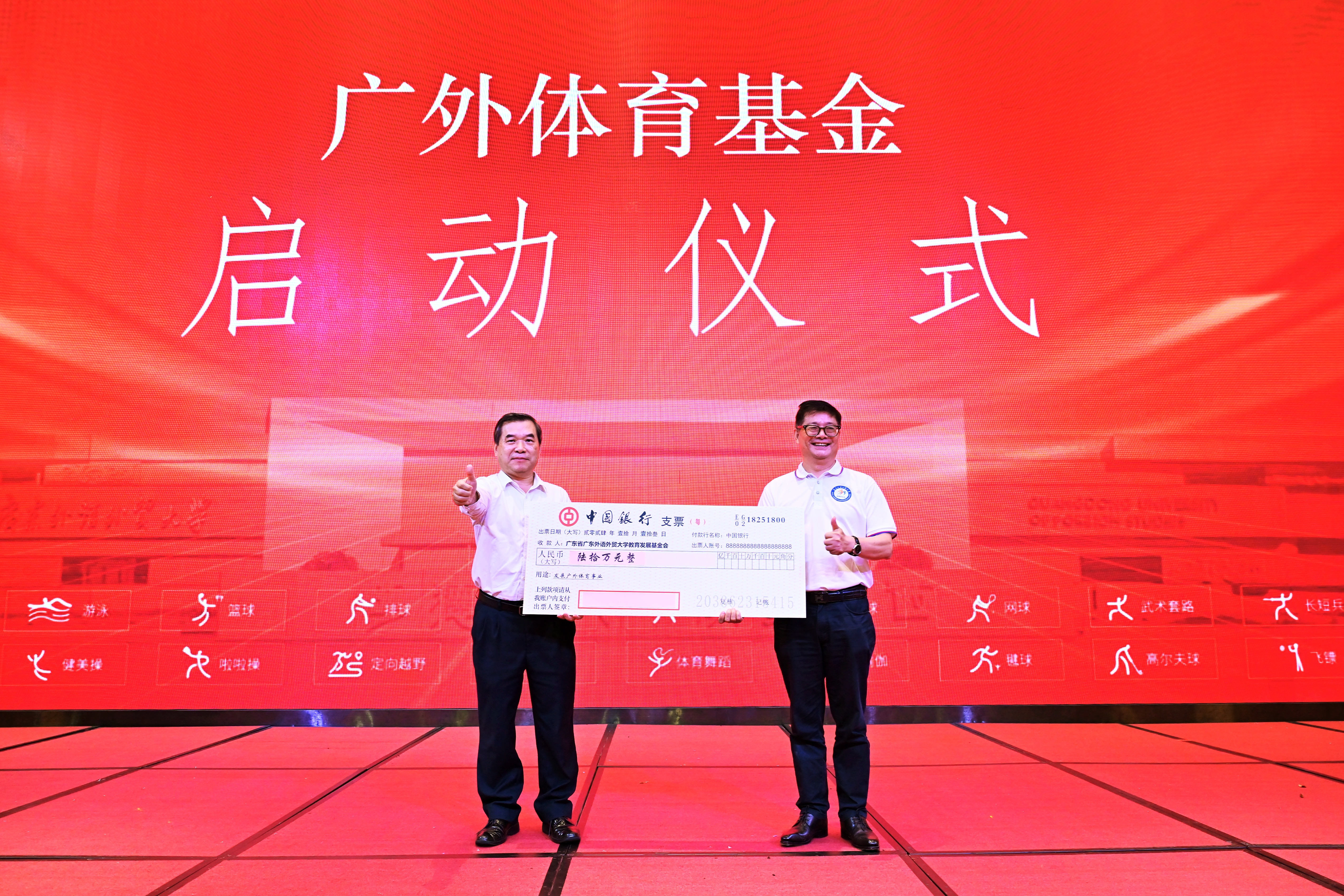 体育基金启动仪式中,黄楠森会长代表广大校友向广外体育基金捐赠支票,焦方太副校长代表学校接收支票。