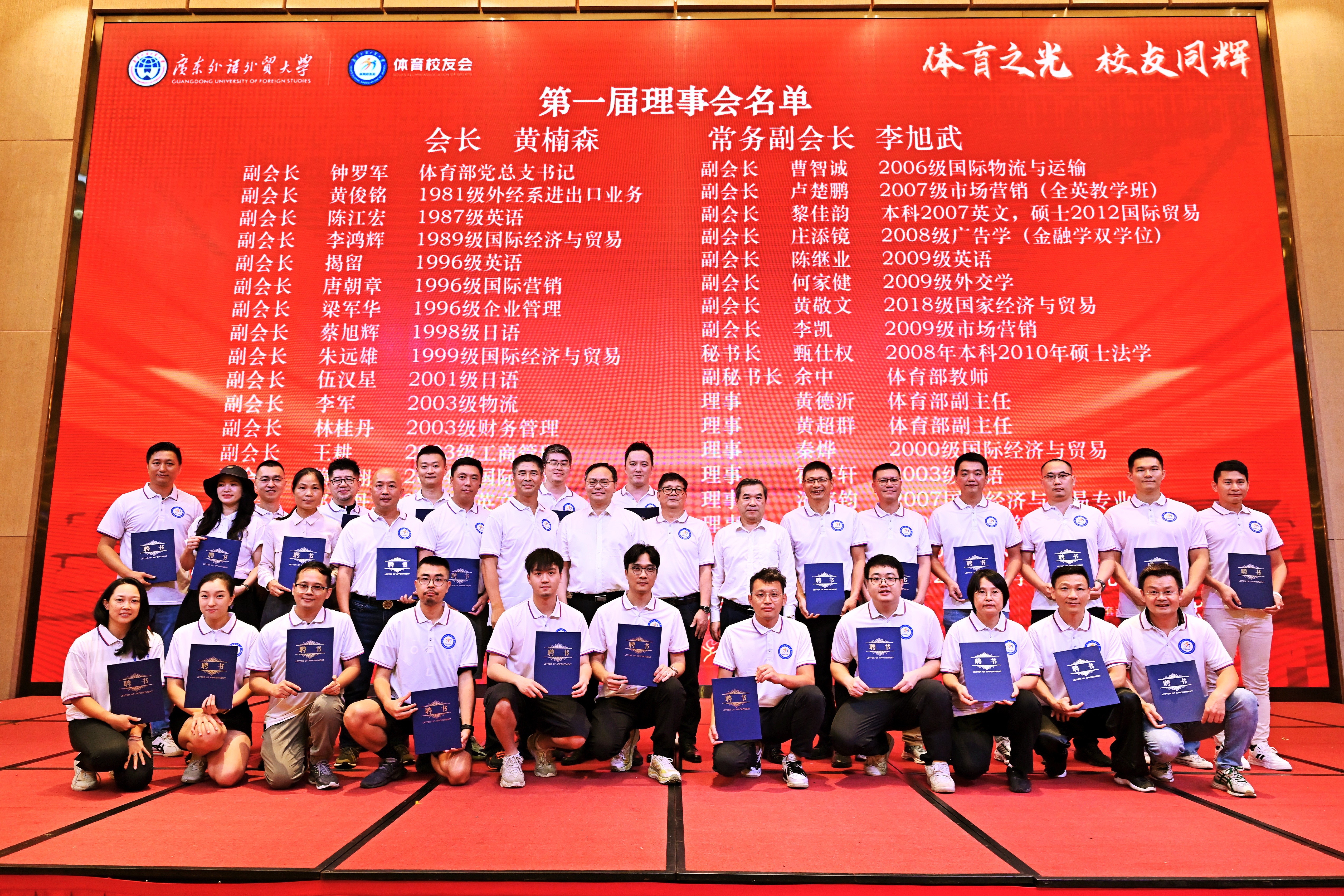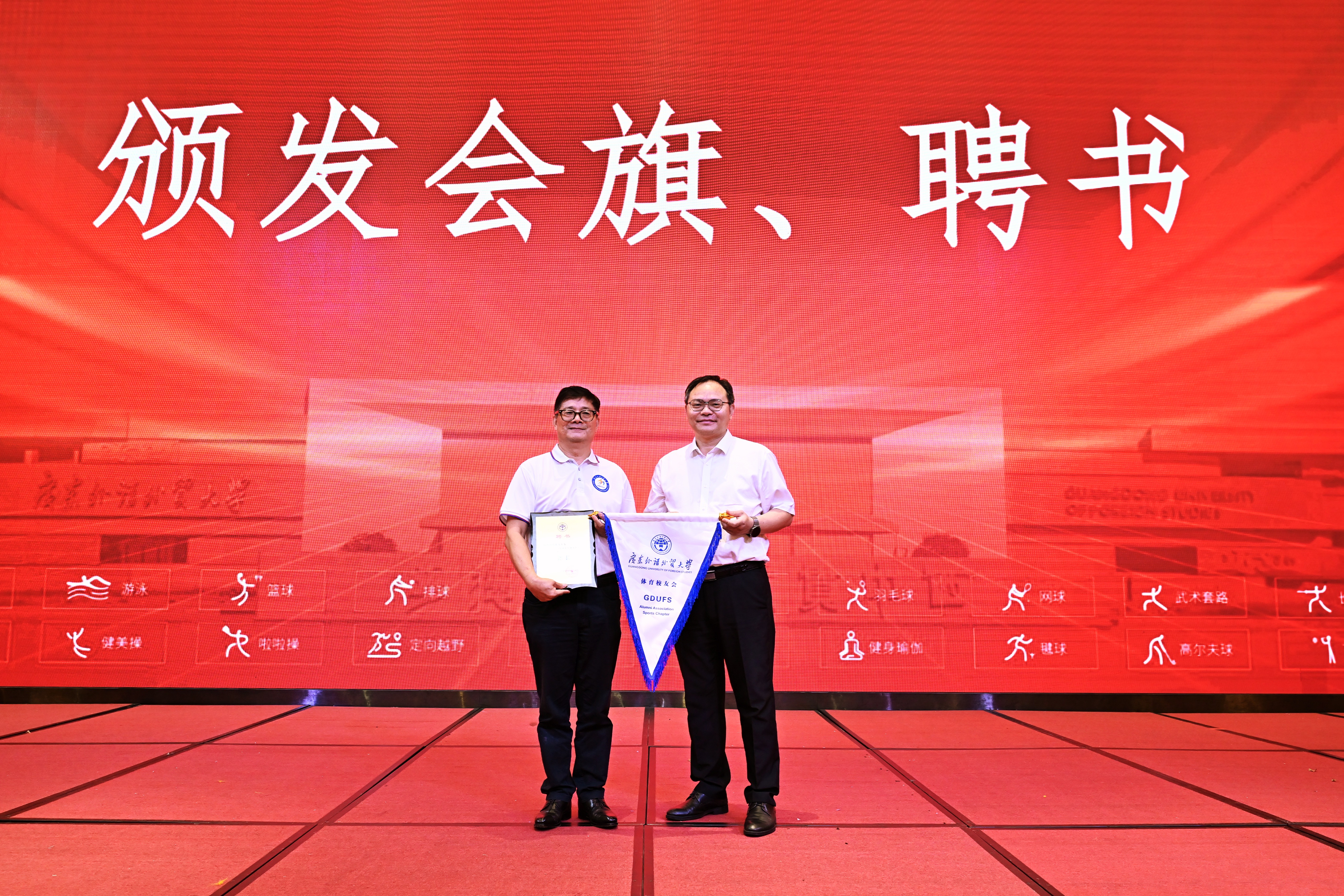 刘建达、焦方太副校长为体育校友会全体理事会成员颁发聘书。