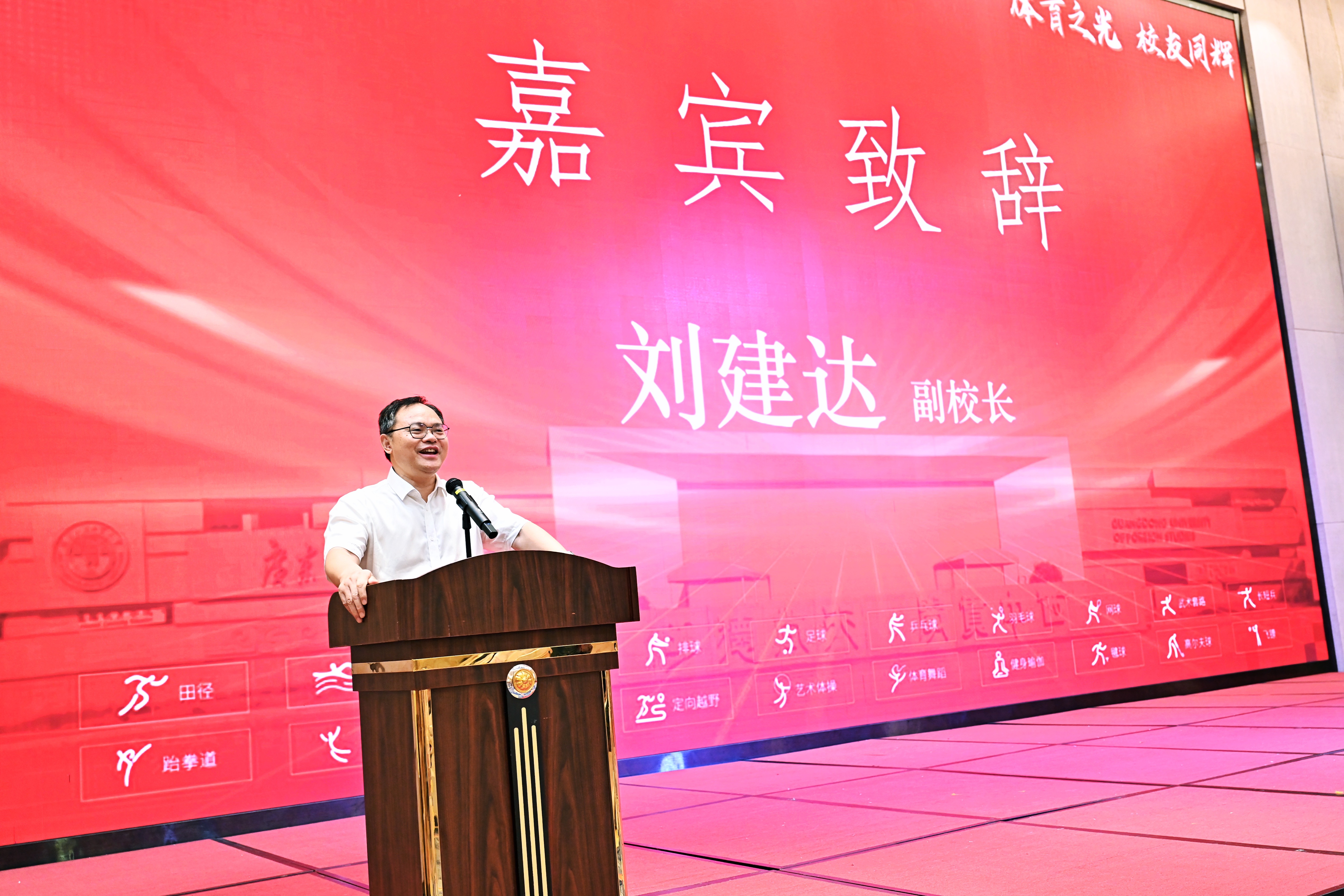 刘建达在致辞中对体育校友会的成立表示祝贺,向长期以来关心和支持学校发展的广大校友表示感谢。他指出,一直以来,学校坚持落实立德树人根本任务,树立“健康第一”的理念,把开展体育运动作为人才培养工作的重要一环,积极探索,勇于创新,充分发挥体育的育人功能。多年来,秉承广外人“挑战自我、超越自我、完善自我、追求卓越”的体育精神,广外师生在赛场上奋勇拼搏,为国家、学校赢得了无数荣誉。校友的发展离不开母校的关怀,学校的繁荣更离不开校友的支持,期待校友们明年学校60华诞再次相聚,共系师生之情,共谋发展之路,共享母校的荣光,共同实现教育强国建设的广外新篇章。